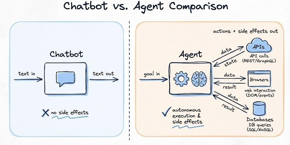 Start with the simplest distinction: a chatbot talks; an agent does.