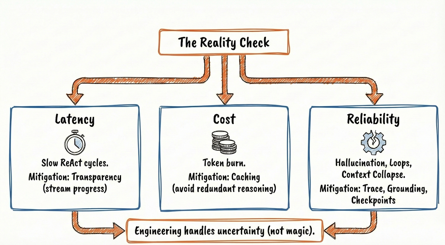 Even with ReAct and these mitigations, complex multi‑step tasks still fail frequently because of error propagation. Design for containment with timeouts, budgets, and circuit breakers. Build in observability. Require human review for irreversible steps.