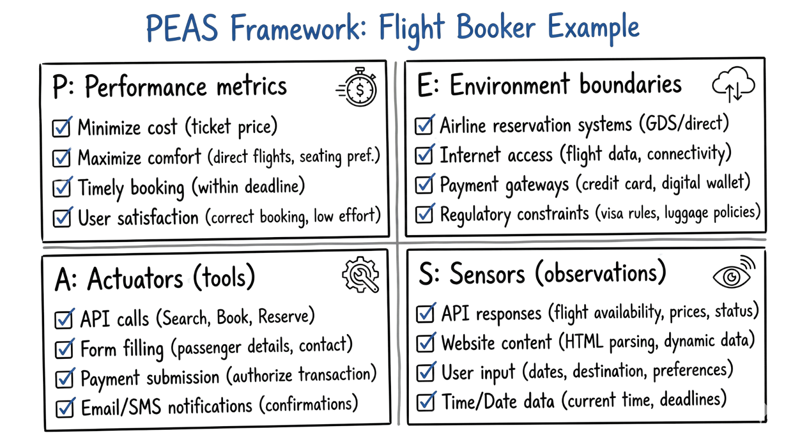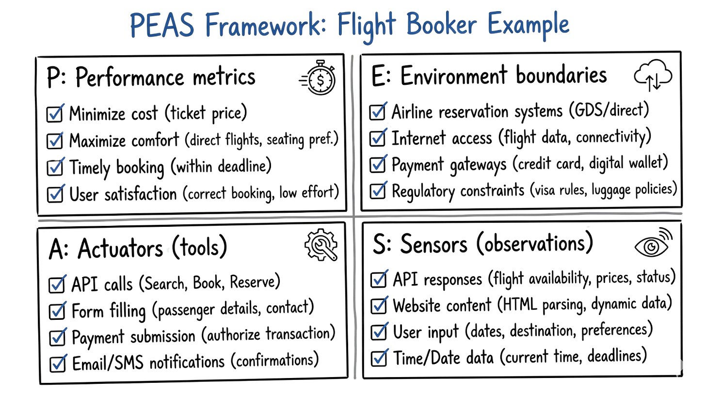 There’s a framework from classical AI called PEAS that makes this concrete.