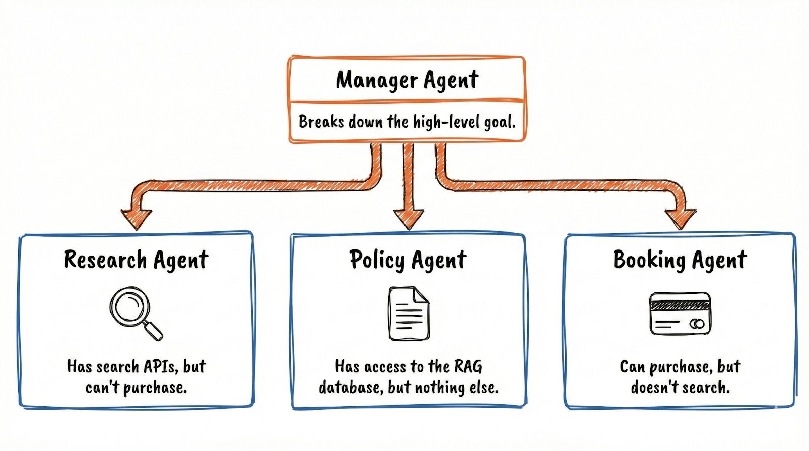 When something fails (no compliant flights found), the manager follows defined backup plans. It might expand the date range or relax constraints. It doesn’t just improvise.