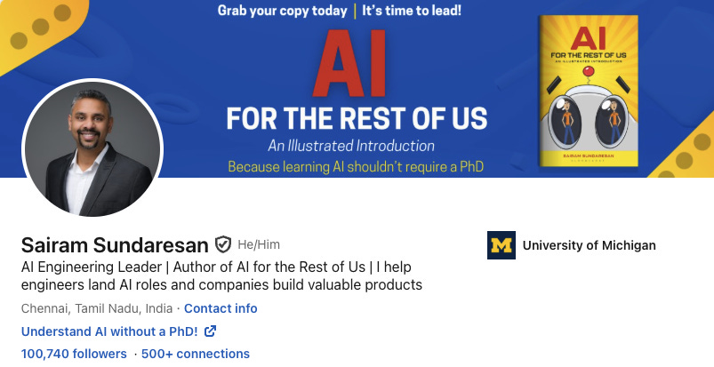 He’s an AI engineering leader with 15+ years of experience building AI and ML systems in industry. He likes to teach AI through illustrations and stories, and he turned the same style into a published Bloomsbury book, AI for the Rest of Us.