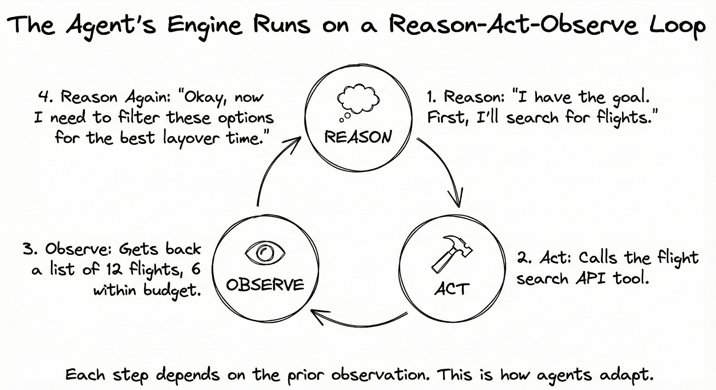 When your agent needs facts (current prices, seat availability, your company’s travel policy), it gets them from tools and memory. The LLM’s job is to figure out what to look up, how to interpret results, and what to do next. Reasoning, not retrieval.