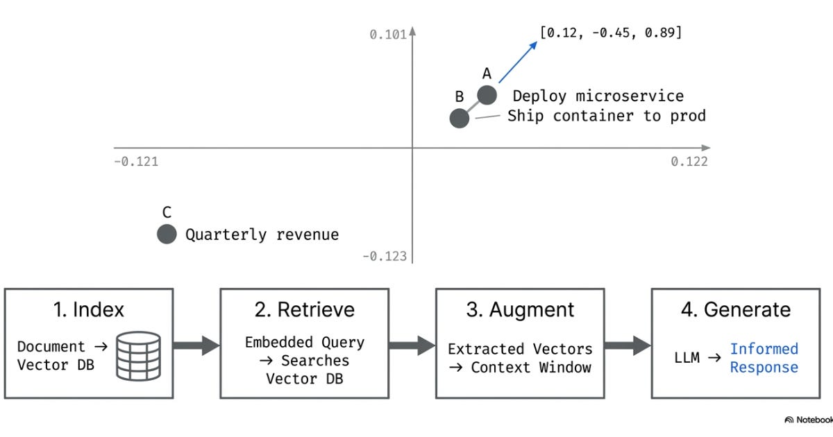 “Deploy a microservice” and “ship a container to production” would be plotted close together. “Deploy a microservice” and “quarterly revenue forecast” would be far apart. Embeddings can do this across thousands of dimensions. Distance in this high-dimensional space equals similarity in meaning.