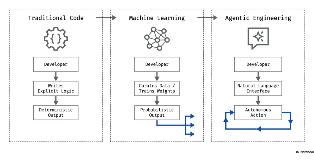 Software 1.0 to 2.0 was the change from logical control flow to probabilistic output. In the shift to Software 3.0, we see probabilistic output used as reasoning loops in an agentic system8.