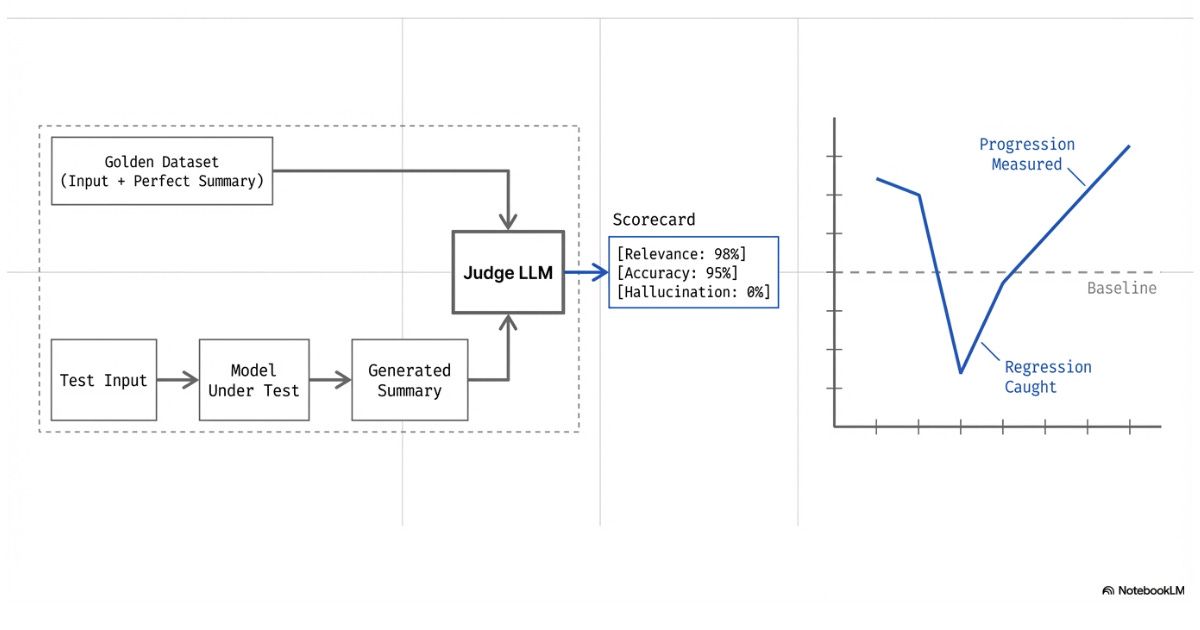 For example, an eval can be used to assess whether an LLM effectively pulls the important information from a document when summarizing. A set of documents and summarization pairs is gathered as a solution set. The documents are run through the LLM we’re testing, and our LLM-as-a-judge compares the solution for that document to our LLM’s output.