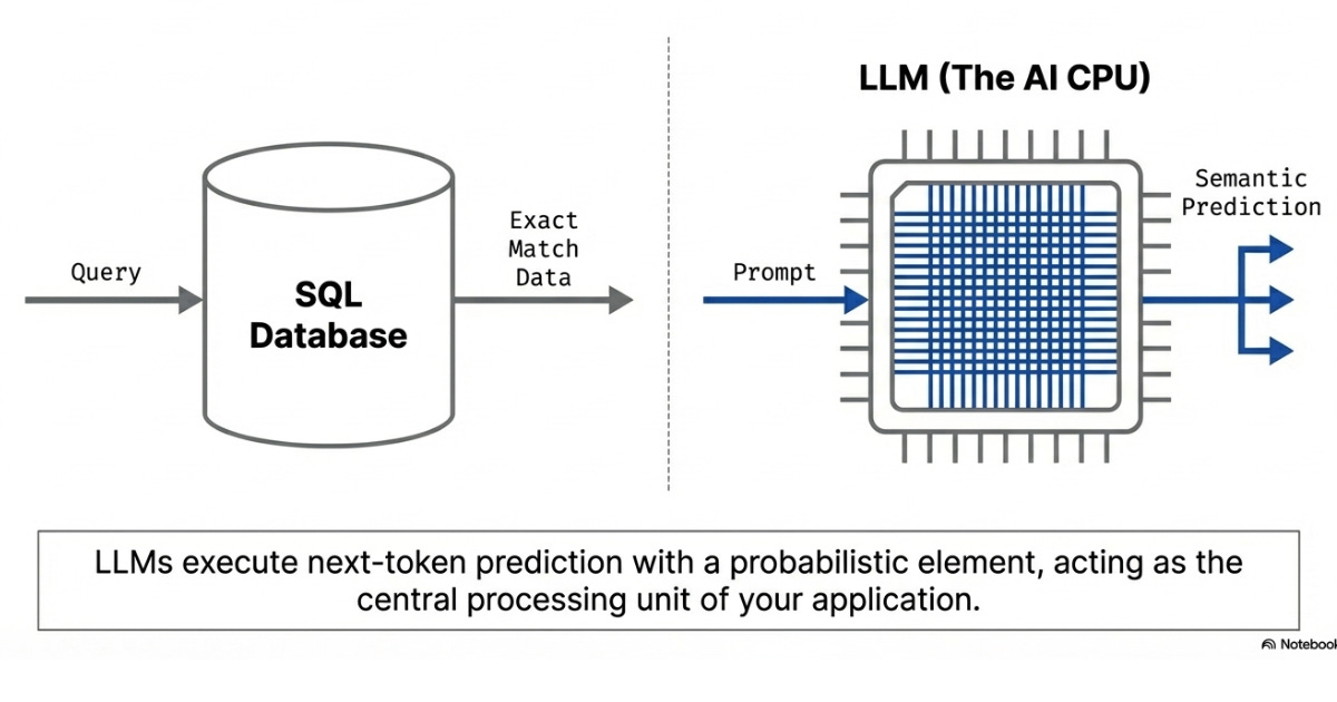 In AI engineering, it’s apt to think of an LLM as the central processing unit (CPU) of your application. By giving an LLM input information, it can make decisions on its own. Thus, the LLM becomes the CPU for your software, deciding what to do with the information provided.