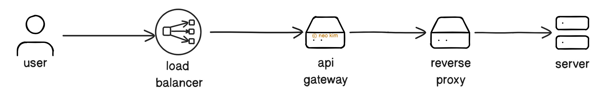 This includes components such as the load balancer, API gateway, and reverse proxy.