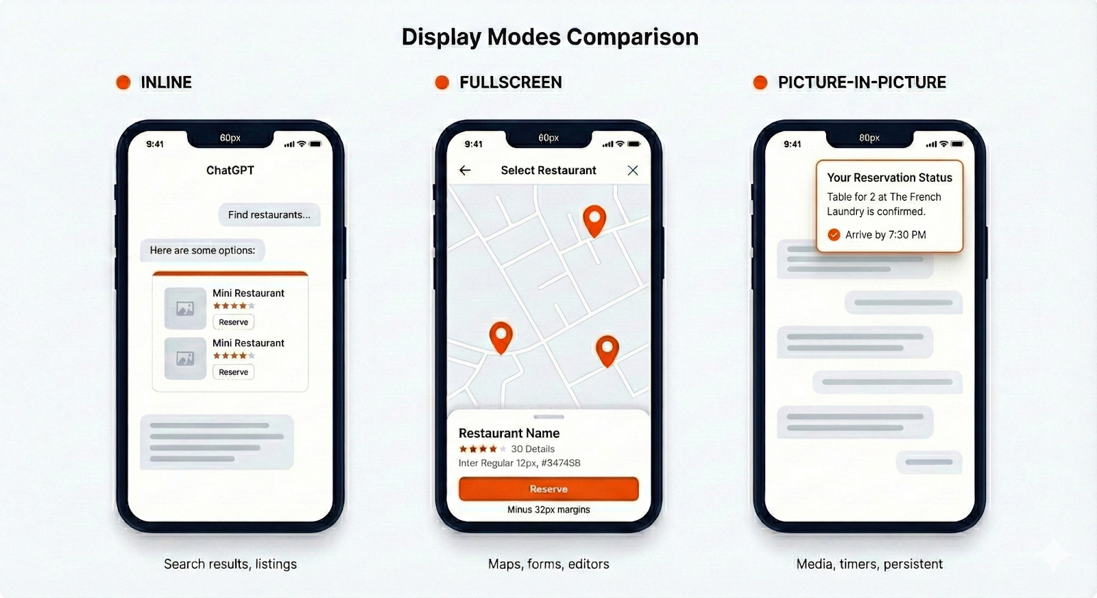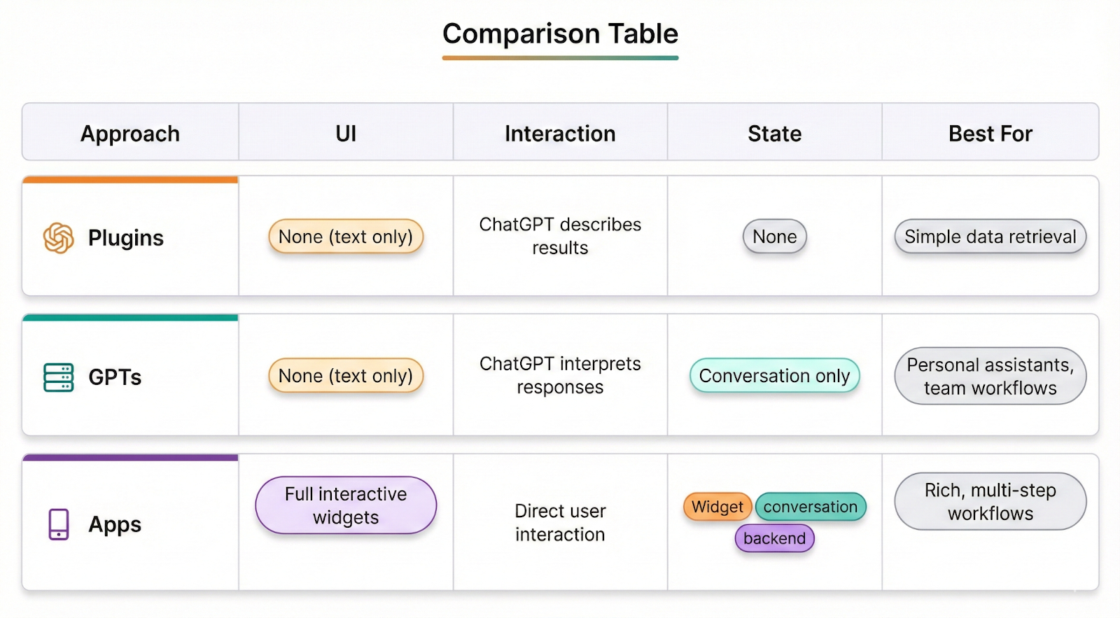 ChatGPT Plugins (launched March 2023, deprecated April 2024) were essentially API wrappers. You’d describe your API endpoints, and ChatGPT would call them and return text. The problem was that everything came back as text that ChatGPT had to interpret and re-present to the user3. There was no native UI, no interactivity, and no way to create rich experiences.