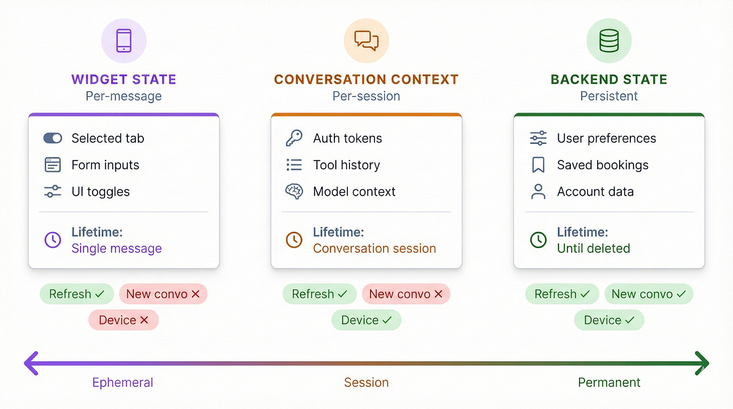 State exists at three levels: widget state is per-message, conversation context is per-session, and backend state is persistent in your database.