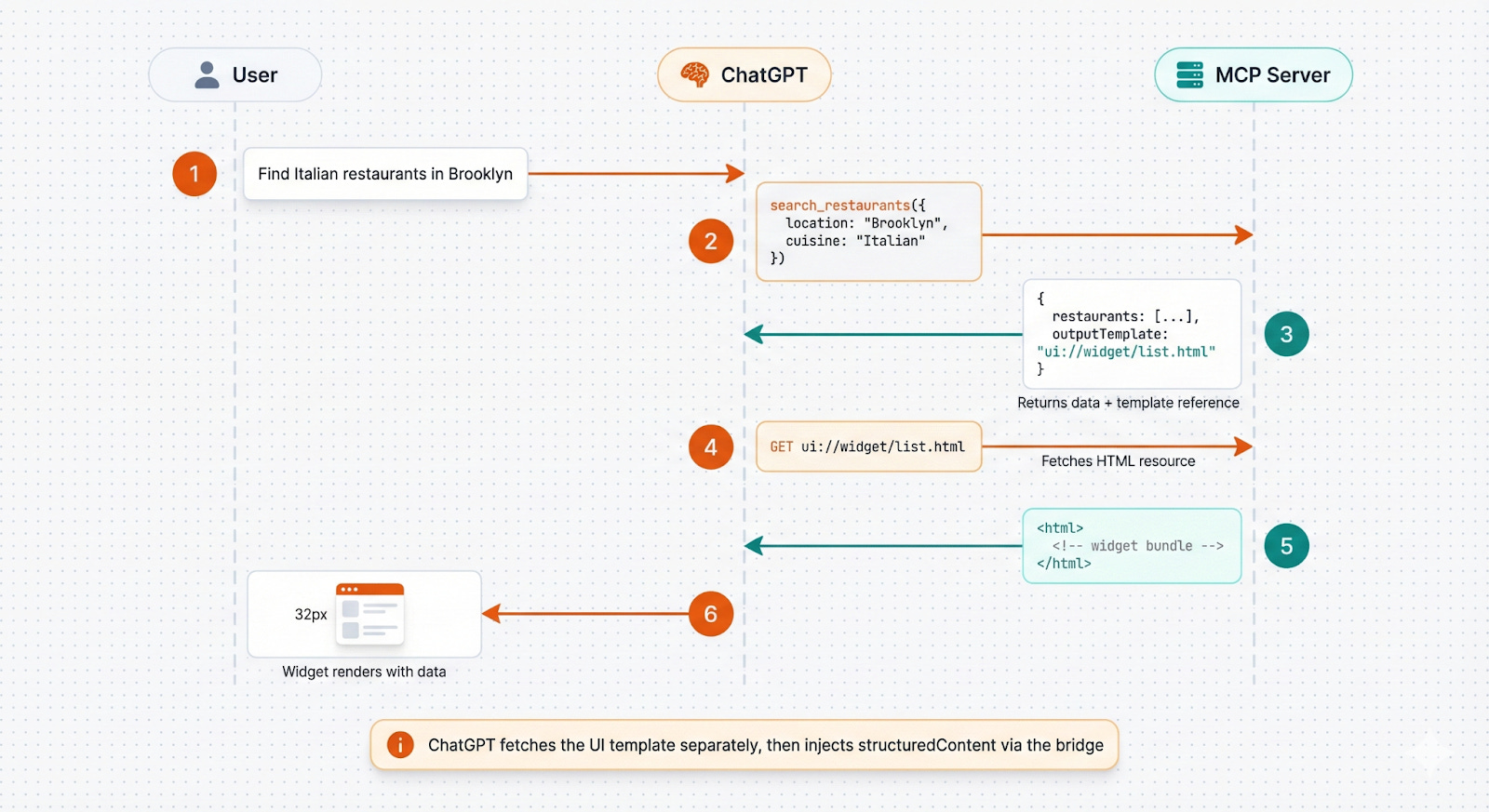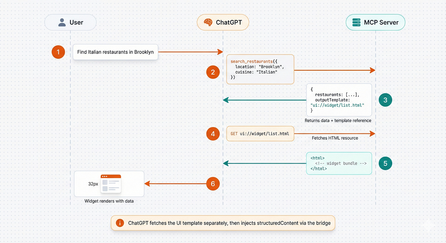 Finally, ChatGPT fetches your HTML bundle, renders it in a sandboxed iframe, and injects your structuredContent via a JavaScript bridge. The user sees an interactive list of restaurants right in their chat.