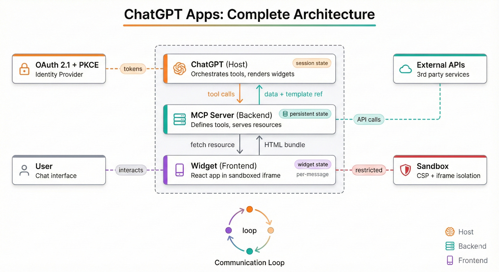 The widget runs in a sandboxed iframe with its own state, its own event handling, and direct communication with your backend4. ChatGPT orchestrates when to show your app, but once it’s rendered, users interact with your UI directly.