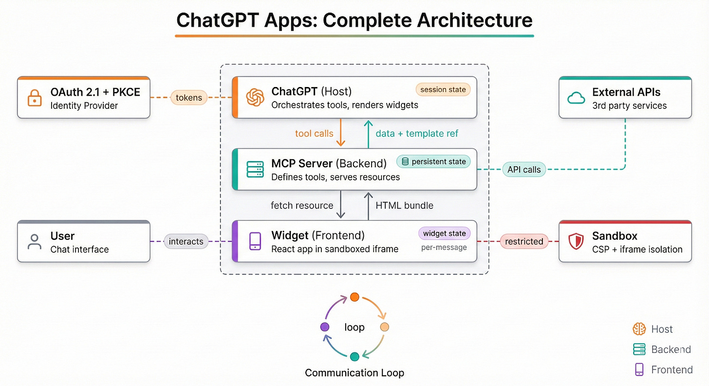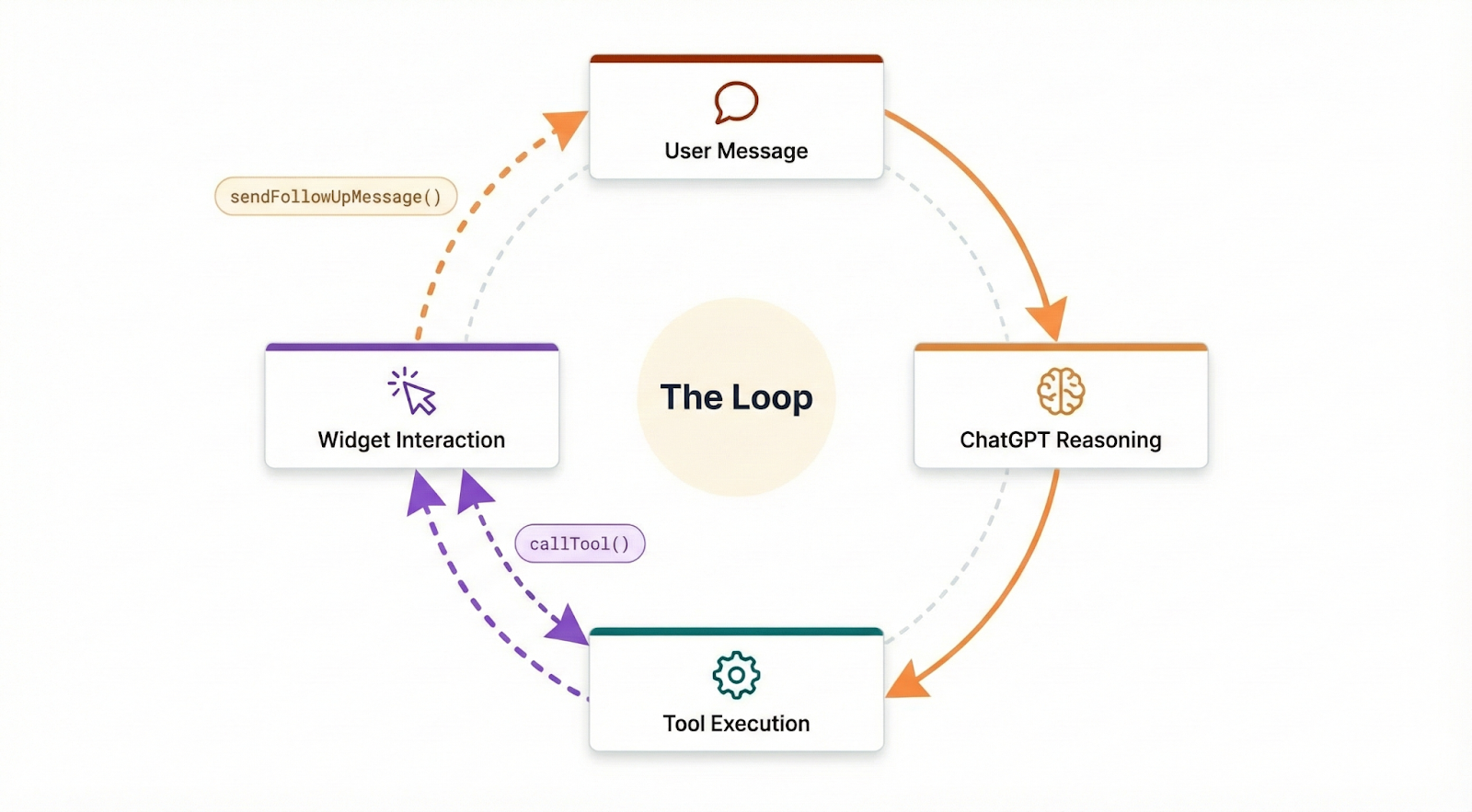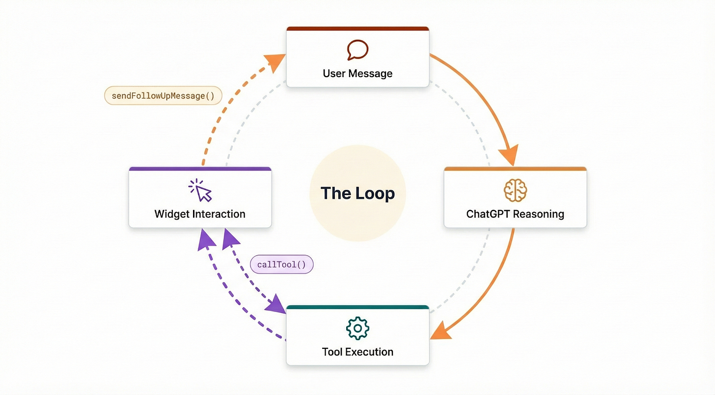 The communication loop is what makes it feel seamless: user speaks → ChatGPT calls tool → widget renders → user interacts → cycle continues.