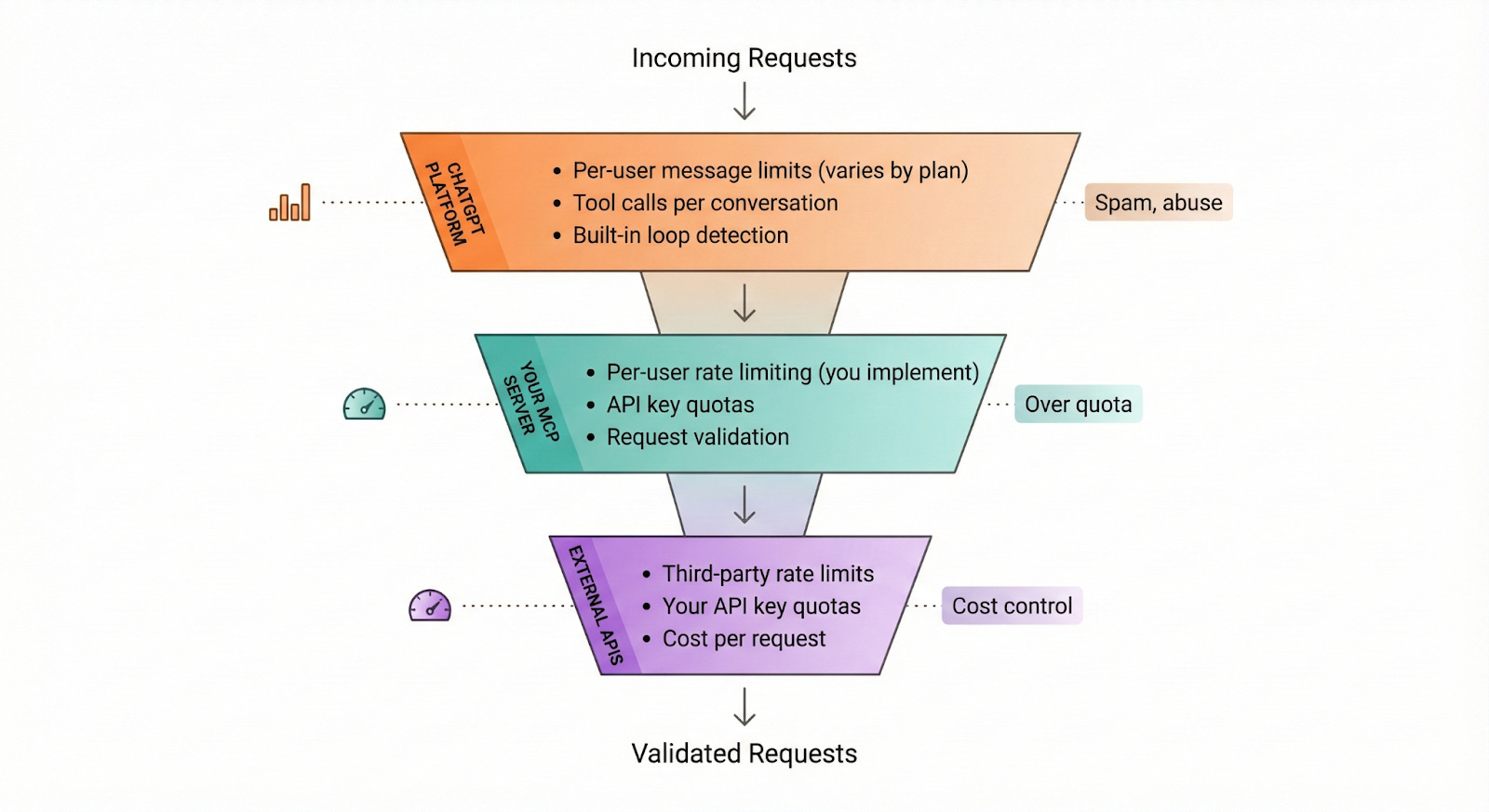 If your app gets stuck calling the same tool repeatedly, ChatGPT will eventually stop. But this is a backstop, not a strategy. This means your server needs its own rate limiting. Implement per-user limits on tool calls and track costs for external API usage. If your app calls the Google Maps API on every tool invocation, and a user asks a vague question that triggers dozens of calls, you’ll see that in your bill.
