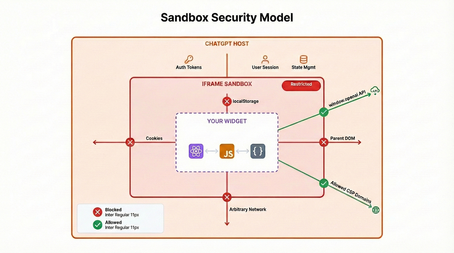 Security is enforced through sandboxing. Your widget can’t access cookies, storage, or arbitrary network requests. Everything flows through declared CSP domains or the window.openai bridge.