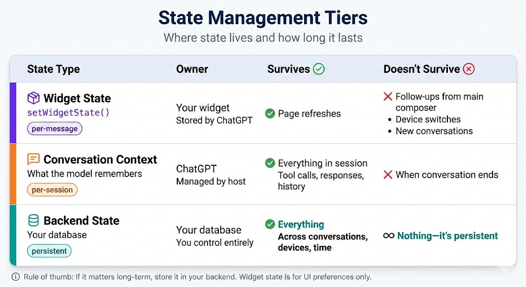 State in ChatGPT Apps exists in three tiers, each with different owners, lifetimes, and purposes. Understanding which tier to use for what is important for building apps that feel reliable.