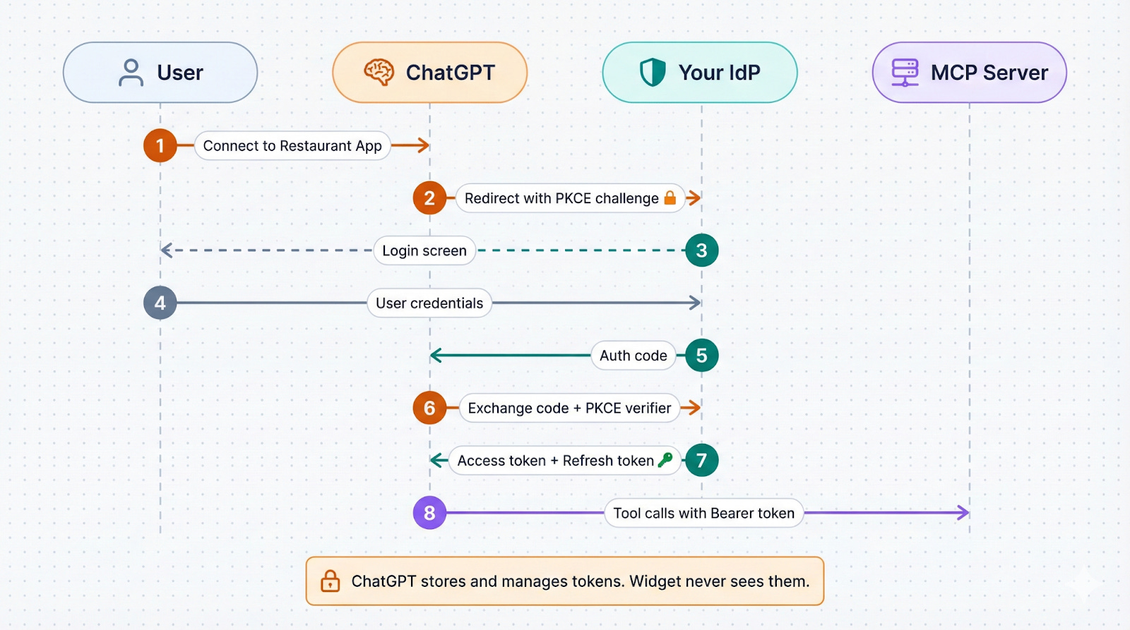All authentication flows go through the ChatGPT host, which keeps credentials out of the browser sandbox. Your MCP server validates tokens on every incoming request: fetch JWKS signing keys, verify the signature and issuer, check expiry and audience claims, and validate scopes.