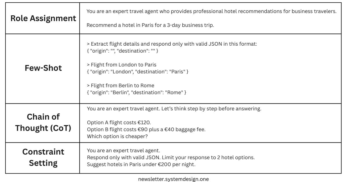 Role Assignment – Setting the persona with instructions like “You are an expert travel agent.” This primes the model to use vocabulary and behaviors associated with that role.