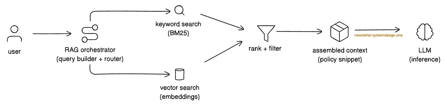 Combining traditional keyword search (BM25)7 with semantic vector search8. Keyword search catches exact matches (“policy ID 998”); semantic search catches conceptual matches (“rules about hotel spending”).