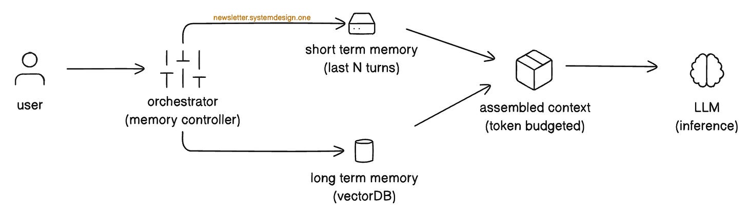 When the user asks about booking a hotel, the system retrieves “User: London-based” and “Preference: Aisle seat” from long-term memory, while keeping the last 3 conversation turns in short-term memory.