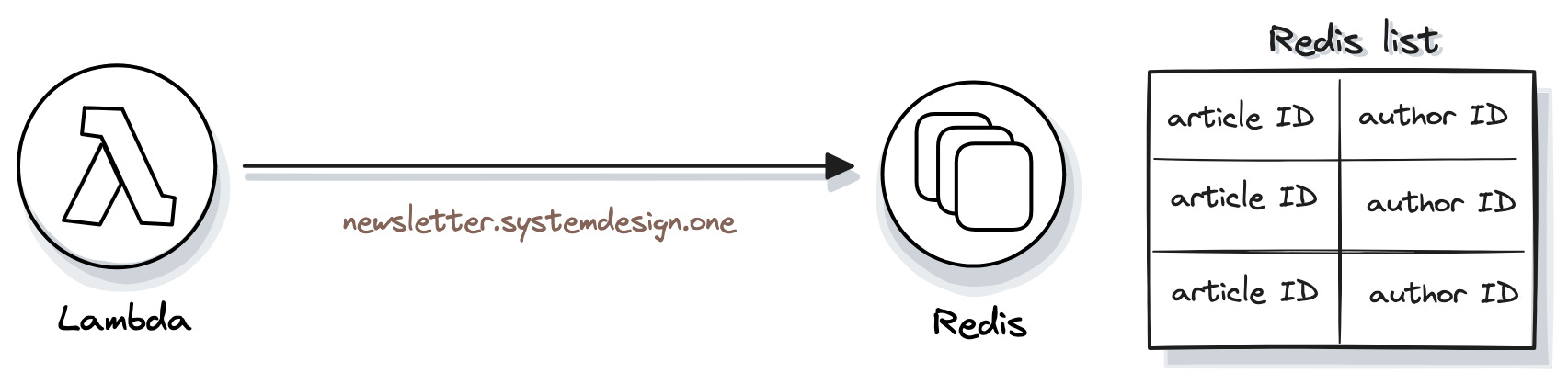 A Lambda function computes the feed when an article gets published. It then inserts the article ID and author ID into each follower’s Redis list.