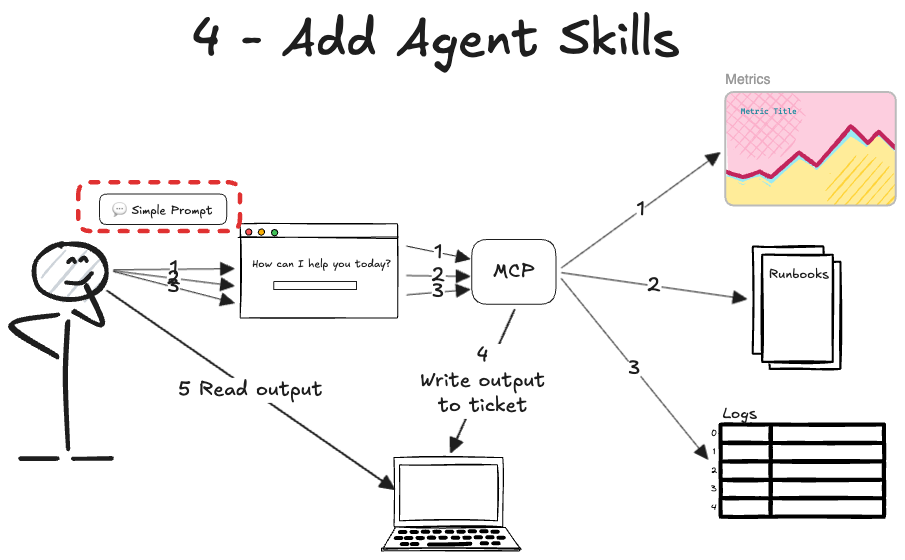 Current state: We still prompt AI the same way. It uses data from skills and logs. It also reads files to understand the system it is debugging. This helps the AI find past errors and the solutions that worked.