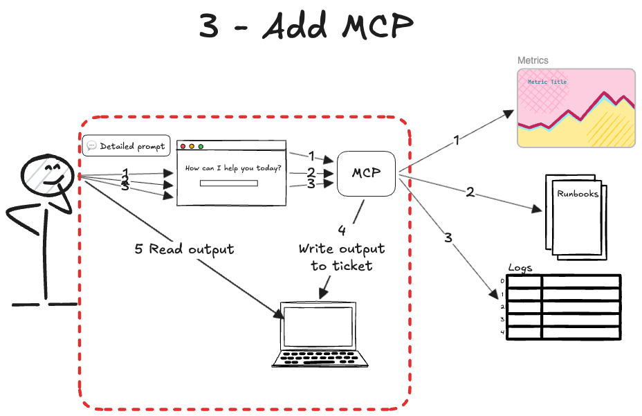 Current state: We have now taught AI how we want certain tasks done, such as metrics and log information. The human is orchestrating the process to do things in order.