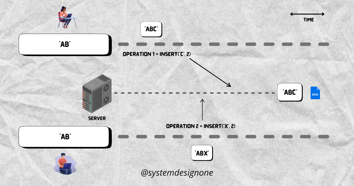 Think of operational transformation as an event-passing mechanism; it ensures each user has the same document state even with unsynchronized changes.