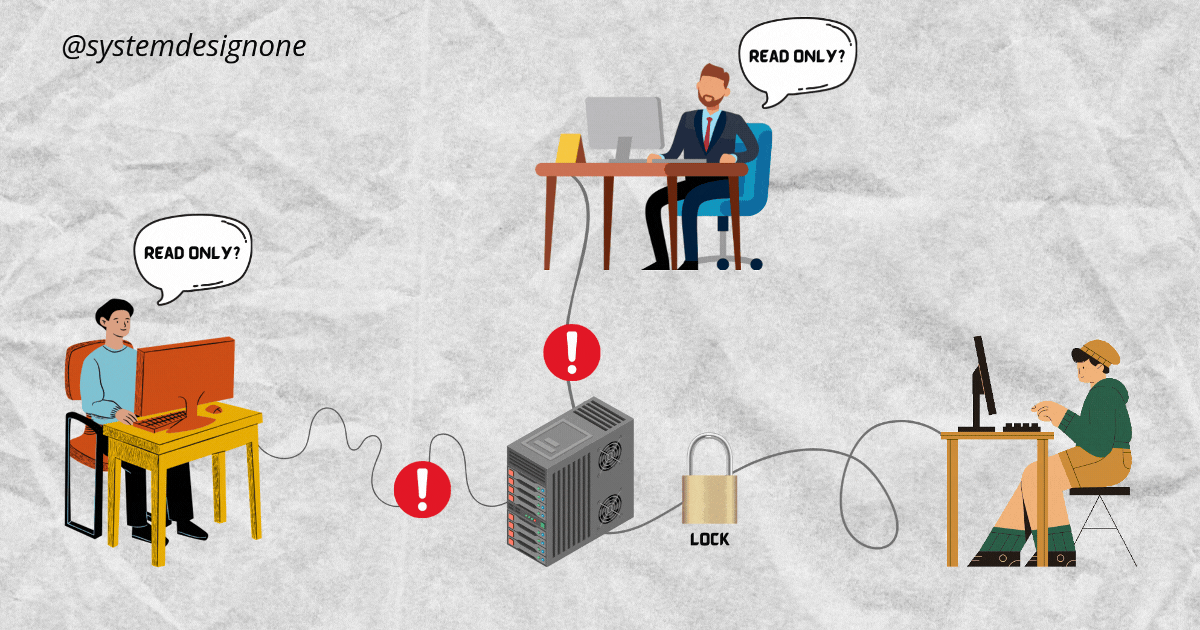 Pessimistic locking is a mechanism for handling concurrency using a lock. It offers strong consistency, but doesn’t support collaborative editing in real-time. Because it needs a central coordinator to handle data changes, only 1 user can edit at a time. Put simply, only a single document copy is available for write operations at once, while other document copies are read-only.