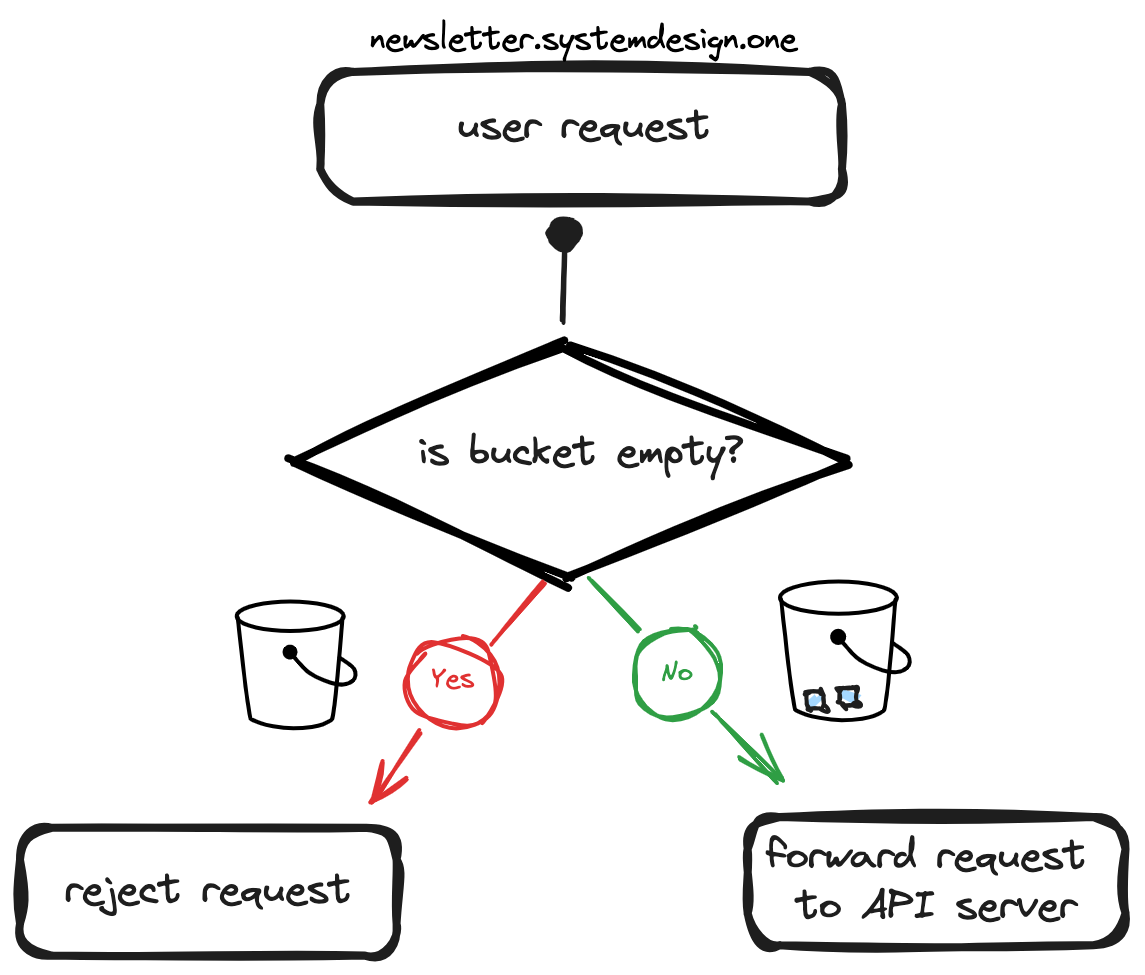 Imagine there is a bucket filled with tokens. Every request must pick a token from the bucket to pass through.