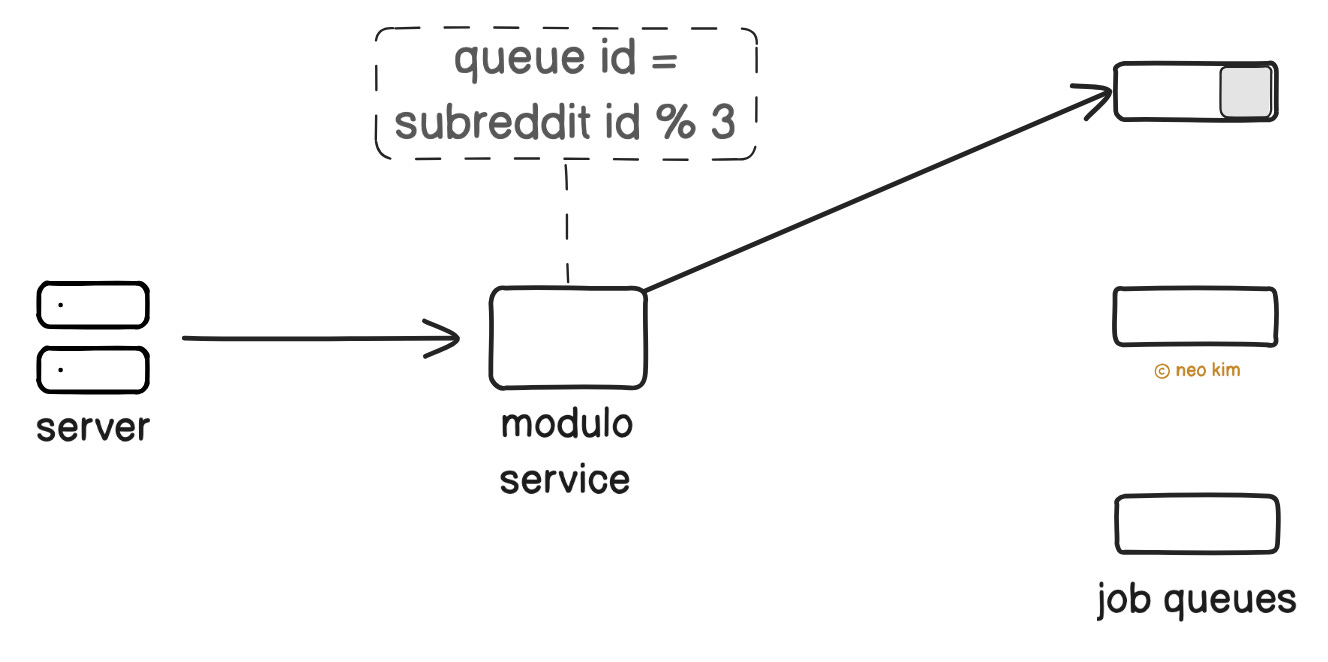 They do a modulo N operation on the subreddit ID to find the correct queue. For example, if there are 3 queues, they do a modulo 3 on the subreddit ID.