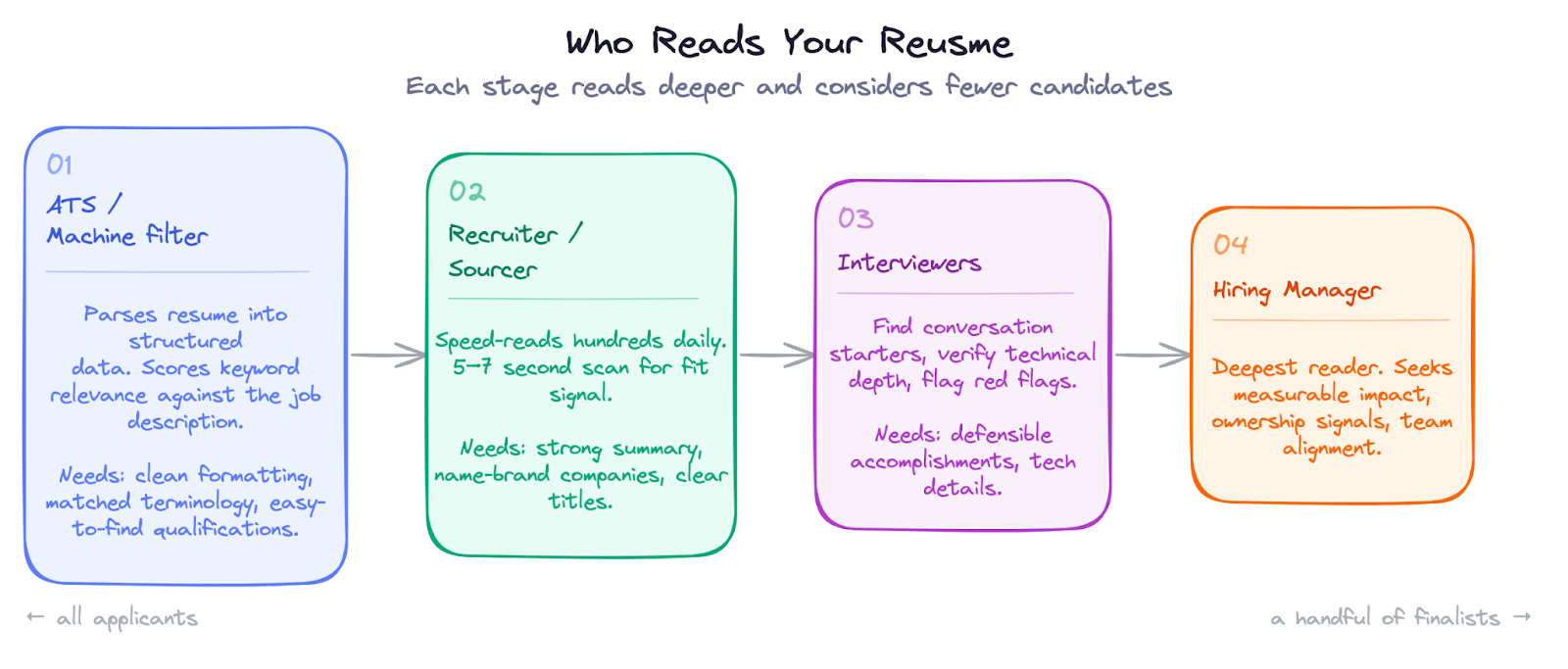 Let’s consider the needs of each of these personas, what they look for in a resume, how they read it, and the decisions they make along the way…