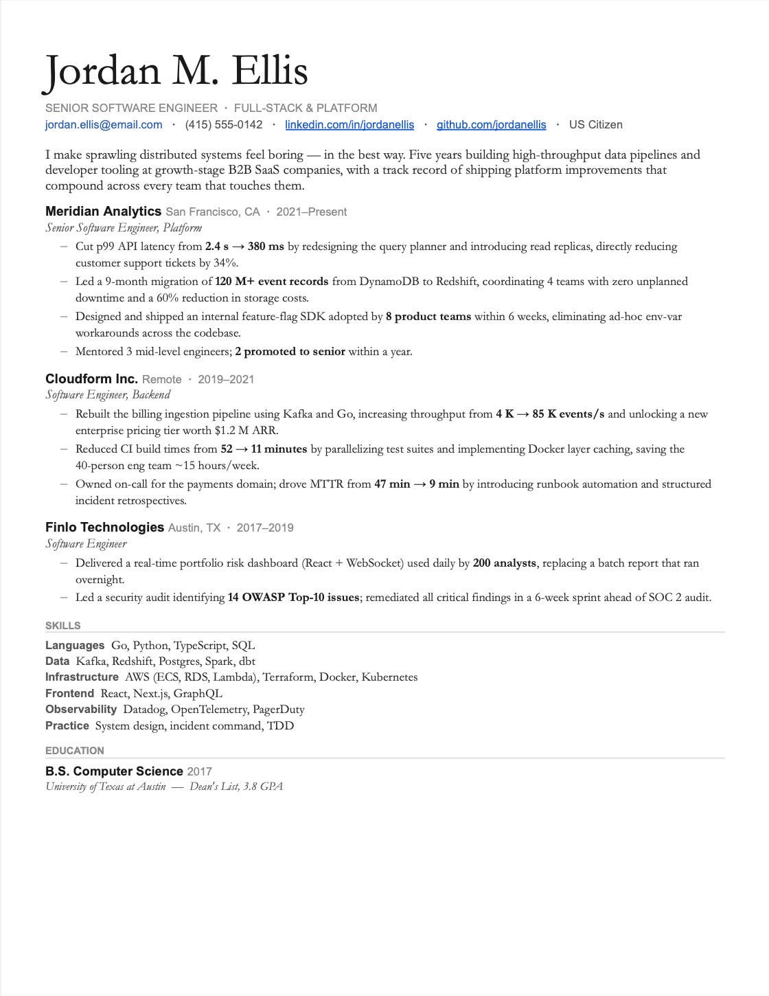 Contact Information – name, email, LinkedIn (maybe GitHub, if it’s good; more on that later)