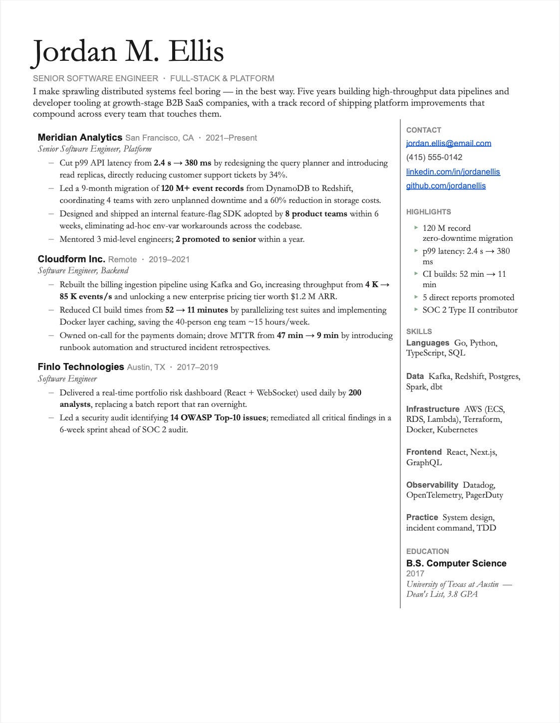 Strong: Cut deploy times from 45 minutes to 8 minutes by parallelizing test suites and implementing Docker layer caching, adopted by 12 engineering teams.