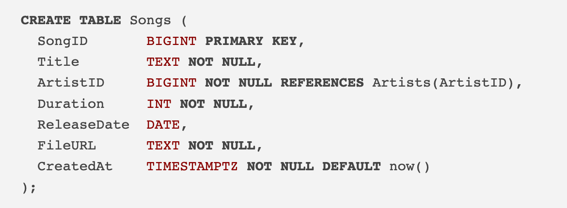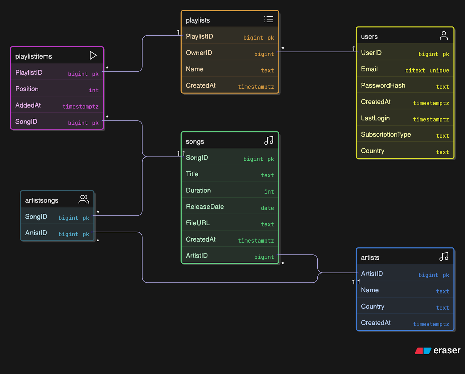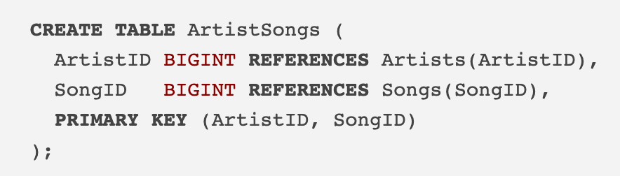 ArtistSongs: a junction table that stores relationships between songs and artists. For example, there could be many-to-many relationships with a song by many artists or many songs by a single artist.