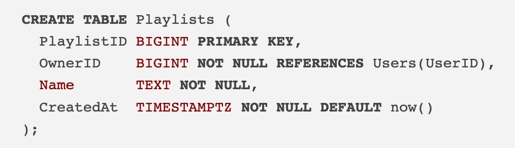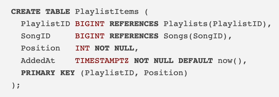 And the playlist items index speeds up queries when fetching songs for a specific playlist or finding which playlists contain a specific song.