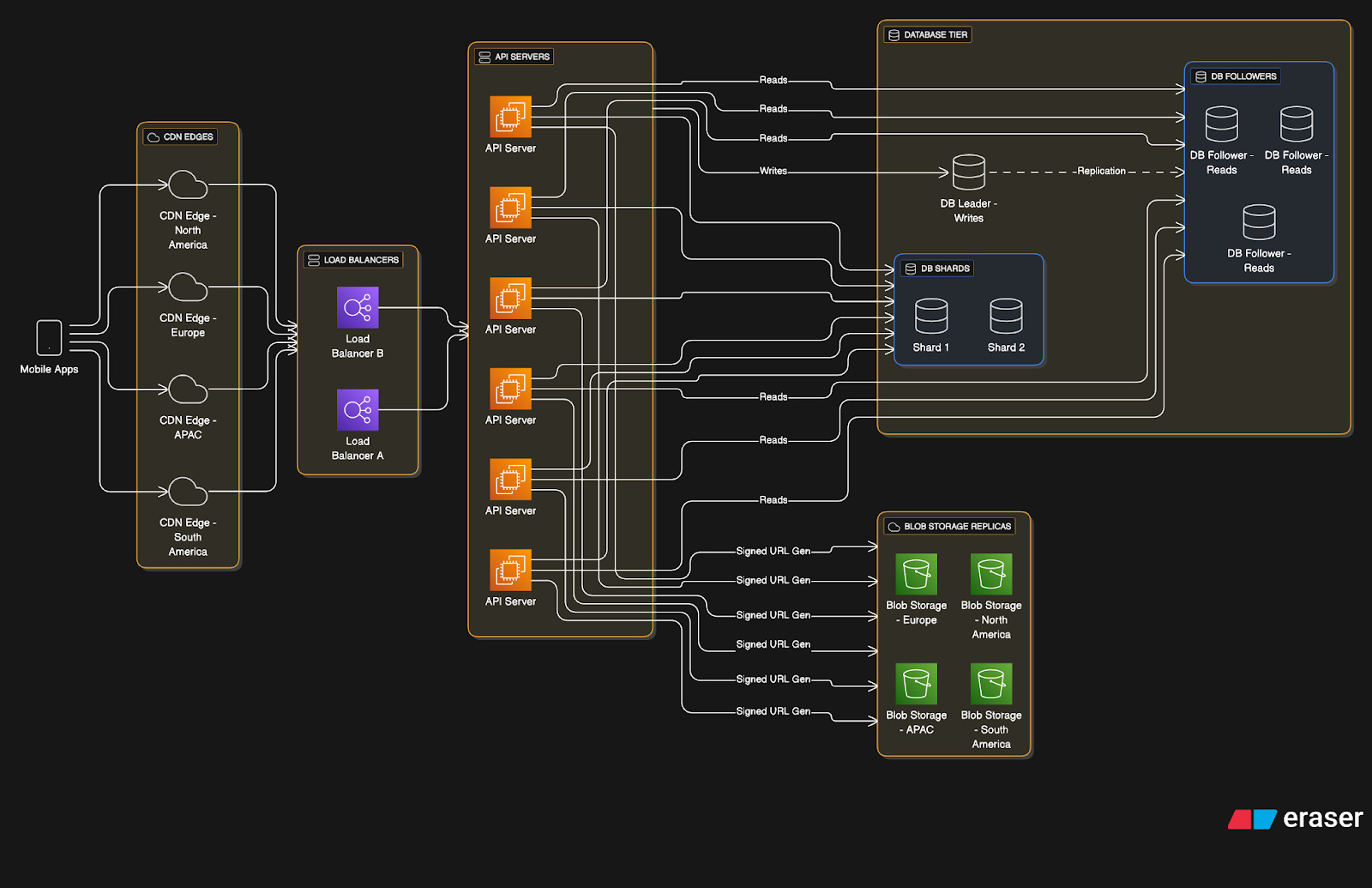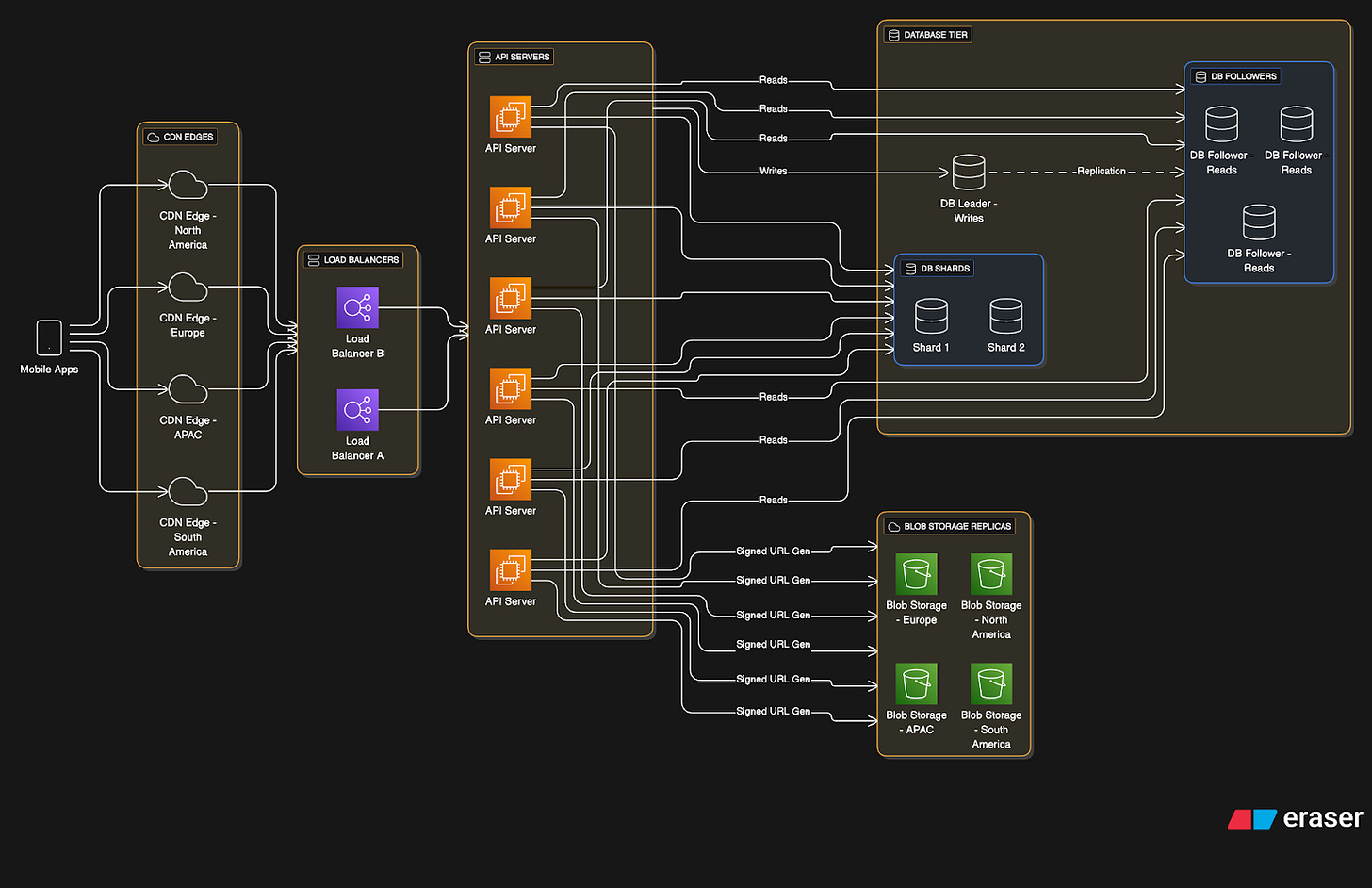 Morning commutes and evening listening sessions create predictable traffic spikes. So it’s necessary to set up many stateless API servers behind the load balancer to handle varying loads throughout the day.