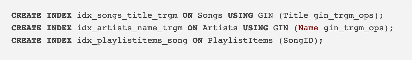 The trigram indexes21 on song titles and artist names enable fast search capabilities, handling typos and partial matches that users expect.