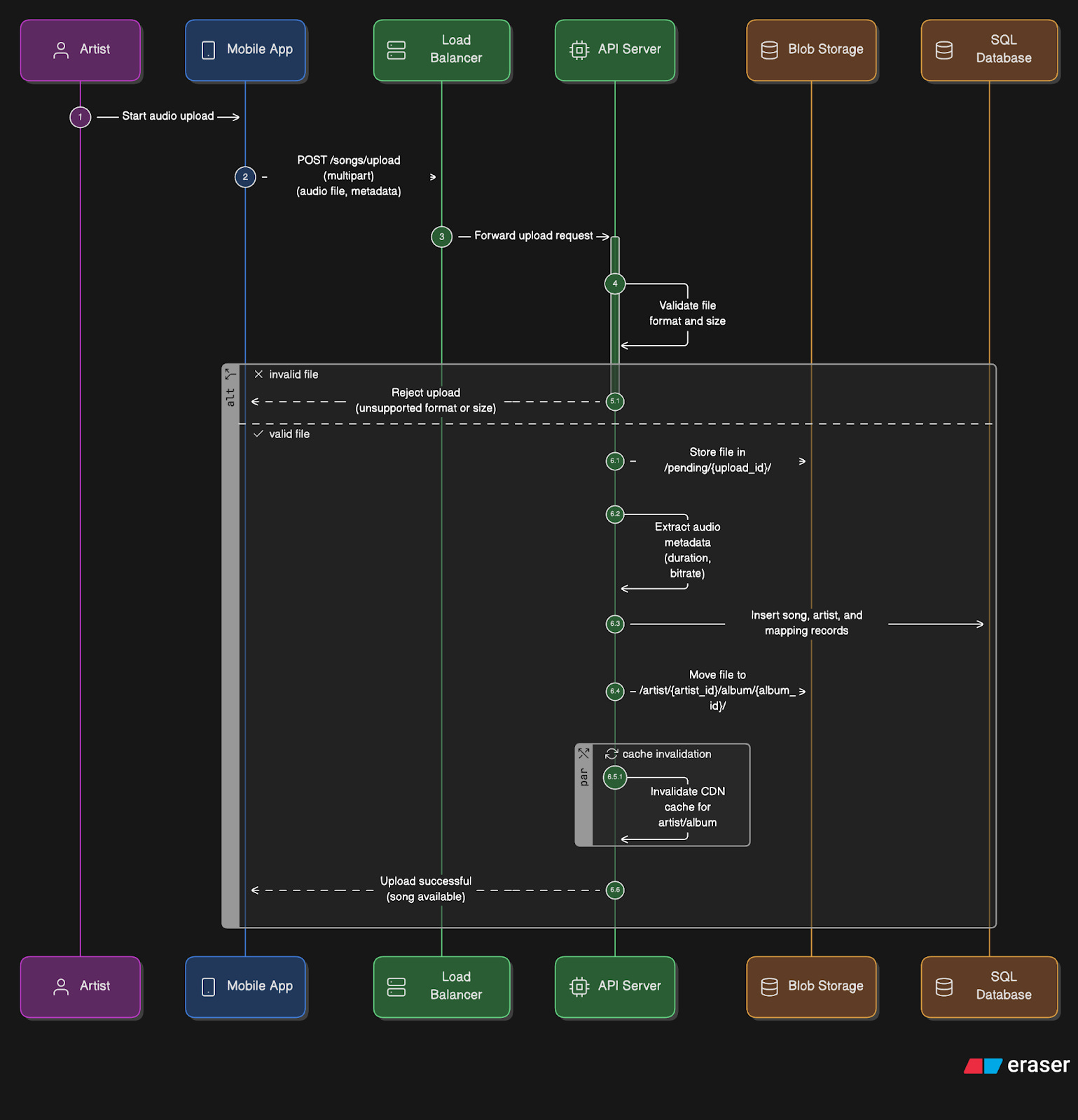 /songs/uploadPOST request with multipart form17 data.File validation → API server checks its format, duration, and file size limits.