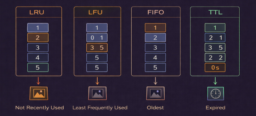 Cache eviction policies decide which data to remove when the cache is full and new data needs space.
