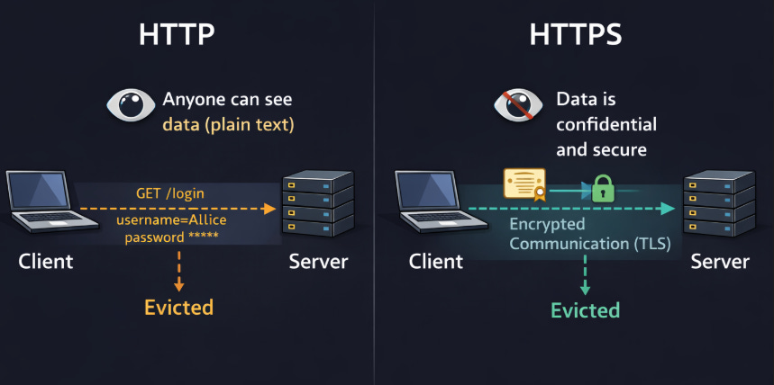 HTTPS is like sending a sealed, locked box. Even if someone intercepts it, they cannot read or change what’s inside.