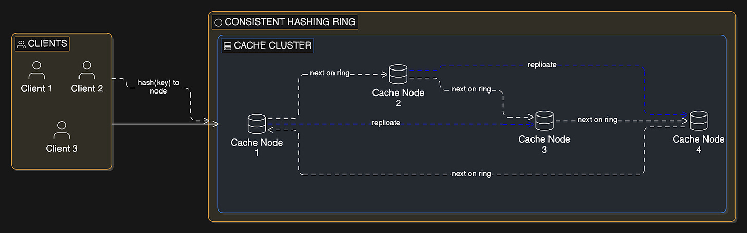 Each cache node stores a portion of the data, typically determined by consistent hashing2. Popular implementations include Redis Cluster and Memcached.