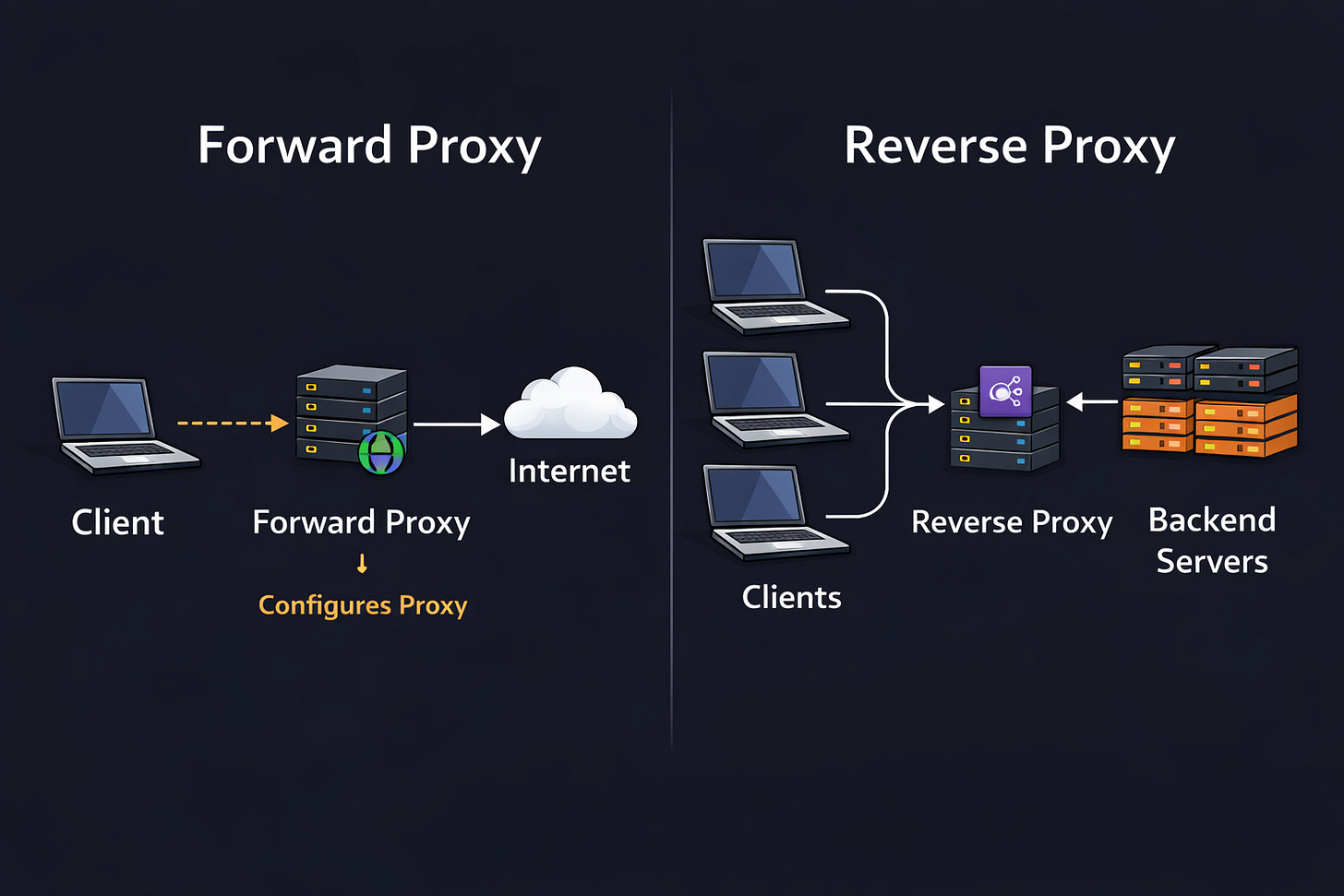 With a forward proxy, client is configured to use it. With a reverse proxy, the client usually doesn’t know it exists.