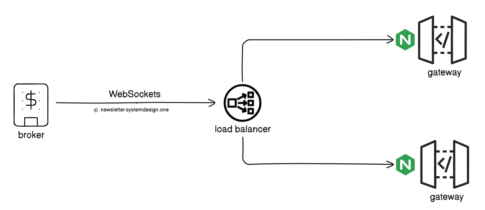 Gateway could use Nginx server for HTTPS termination and WebSocket routing. Plus, exchange could run many gateway servers in parallel behind a load balancer for high availability.
