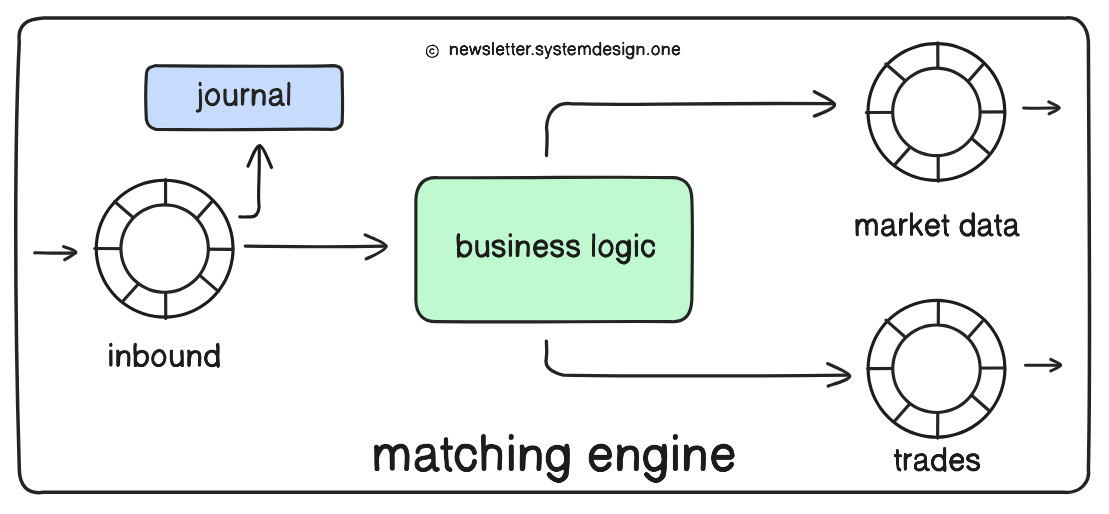 Order manager uses disruptors to broadcast events to various internal consumers, such as: