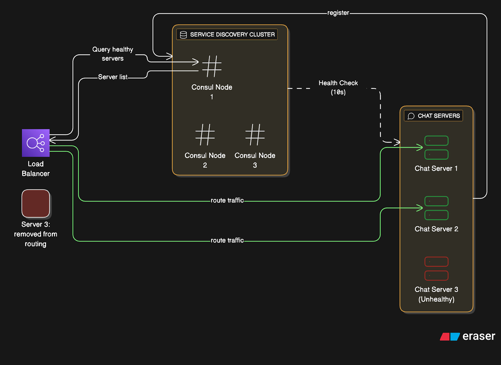 Think of it as a traffic cop routing cars to different lanes. It routes incoming WebSocket connections to chat servers and uses sticky sessions (meaning once you connect to Server A, you stay on Server A). Simply put, users don’t bounce between servers mid-conversation.