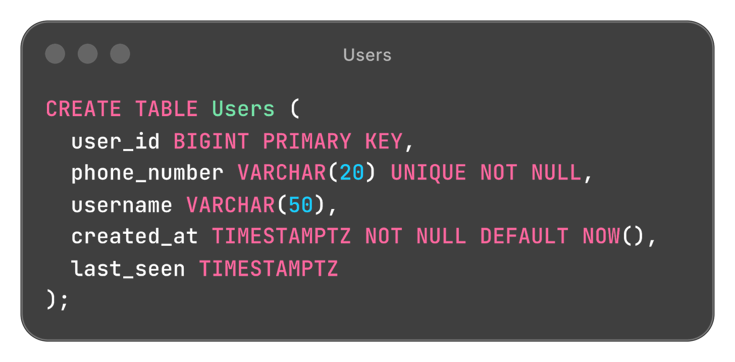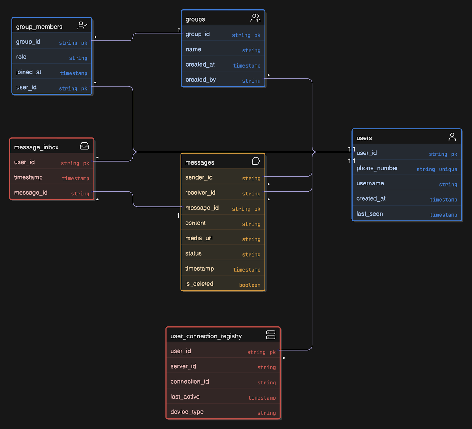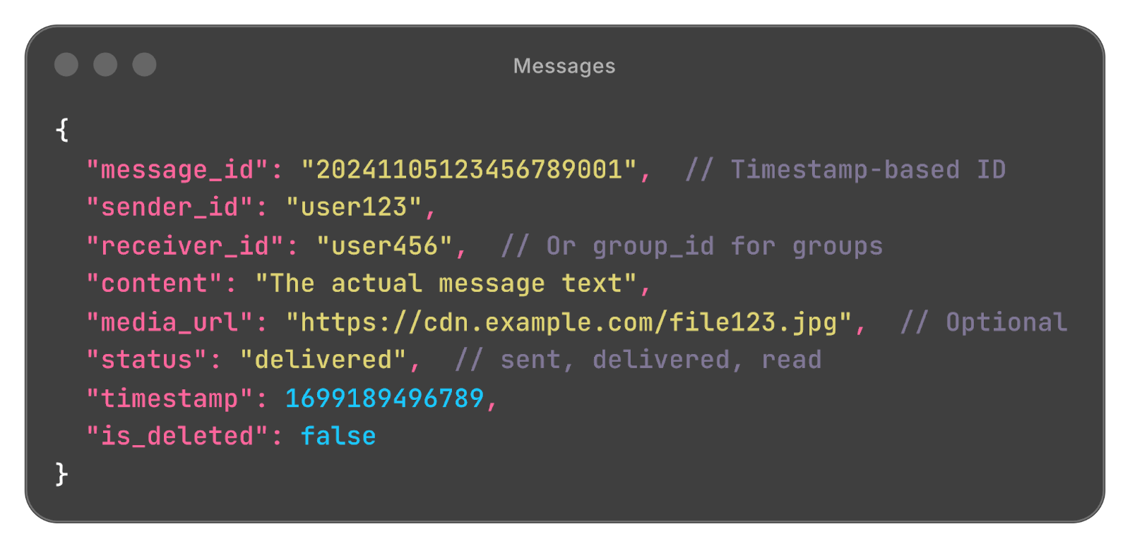 NoSQL works well here (Cassandra, DynamoDB) because we need high write throughput and our query patterns are straightforward (fetch messages by user/conversation/timestamp).