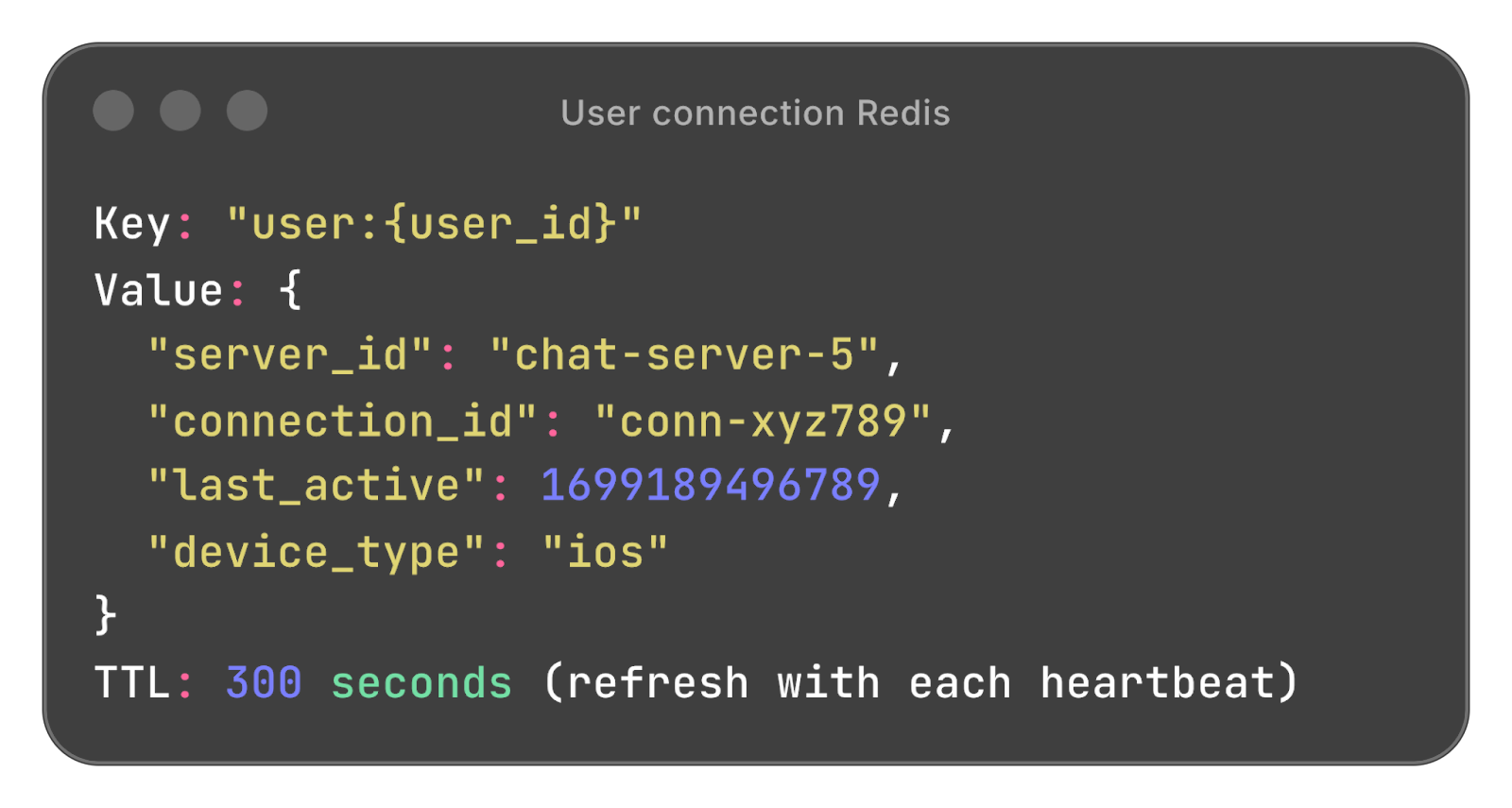In-memory store (Redis) tracks which users are online, which chat server they’re connected to, and their last activity timestamp.